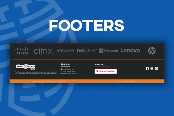 All Websites Need a solid footer at the end of the site. We've got you covered with prebuilt ones ready to be customized.